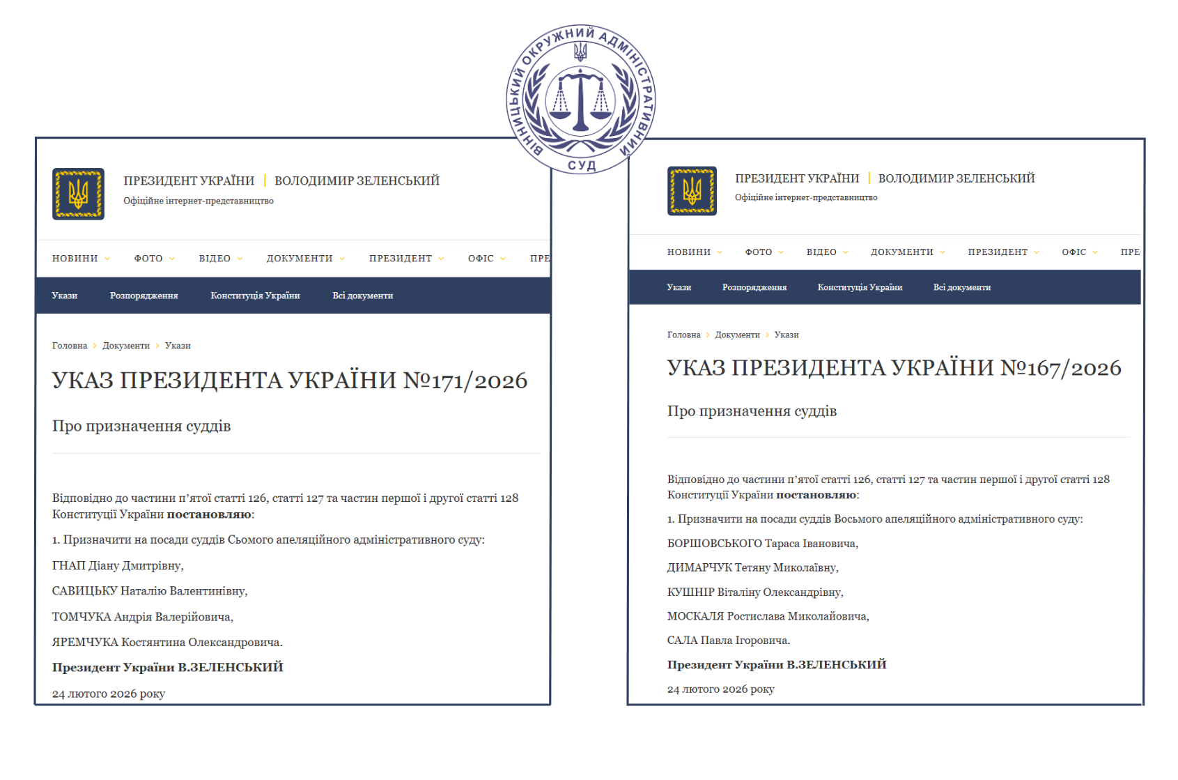 Судді Вінницького окружного адміністративного суду Андрій Томчук та Костянтин Яремчук призначені на посади суддів Сьомого апеляційного адміністративного суду і Павло Сало призначений на посаду судді Восьмого апеляційного адміністративного суду.